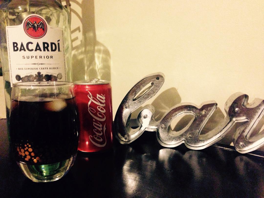 Bacardi 40% alcohol, Coca Cola.